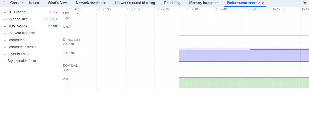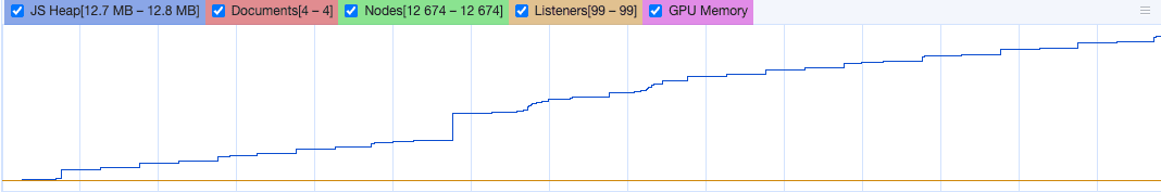 可以通过Performance面板查看相关的内存信息。开启Record之后,可以根据内存变化的折线图,来判断内存的变化情况 内存分为:JS Heap、Documents、Nodes、Listeners、GPU Memory JS变量的多少决定JS Heap的大小,dom节点数量的多少决定Nodes的大小