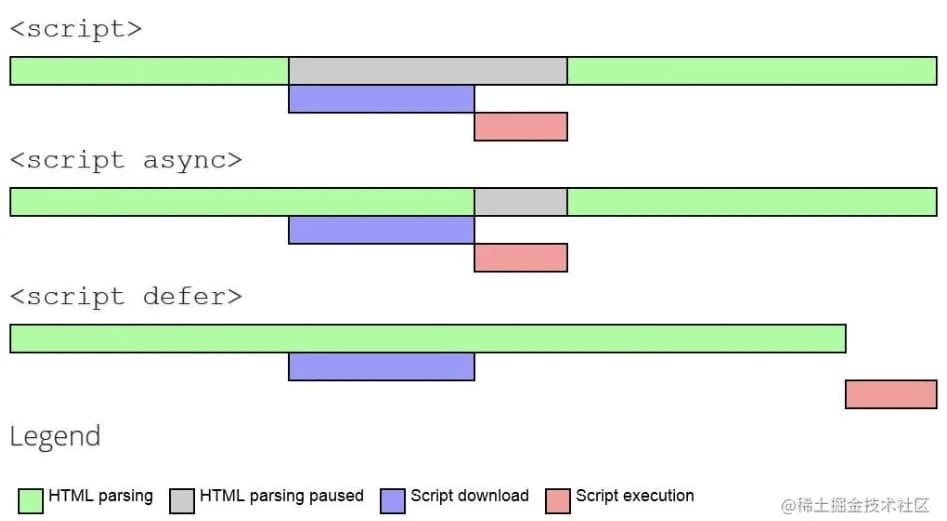 defer: 脚本会被延迟到整个页面都解析完毕后再运行。defer脚本总是在 DOM 准备好时执行(但在DOMContentLoaded事件之前), defer在一般情况下是按照记载顺序执行。